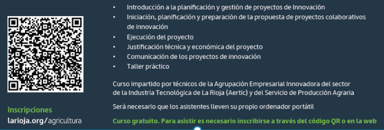 La Consejería de Agricultura, Ganadería, Mundo Rural y Medio Ambiente organiza el Curso de Introducción a la gestión de proyectos colaborativos de innovación, que tendrá lugar los días 28 y 29 de enero de 2025 en la Sala de Seminarios del edificio administrativo del ICVV (La Grajera, Logroño).